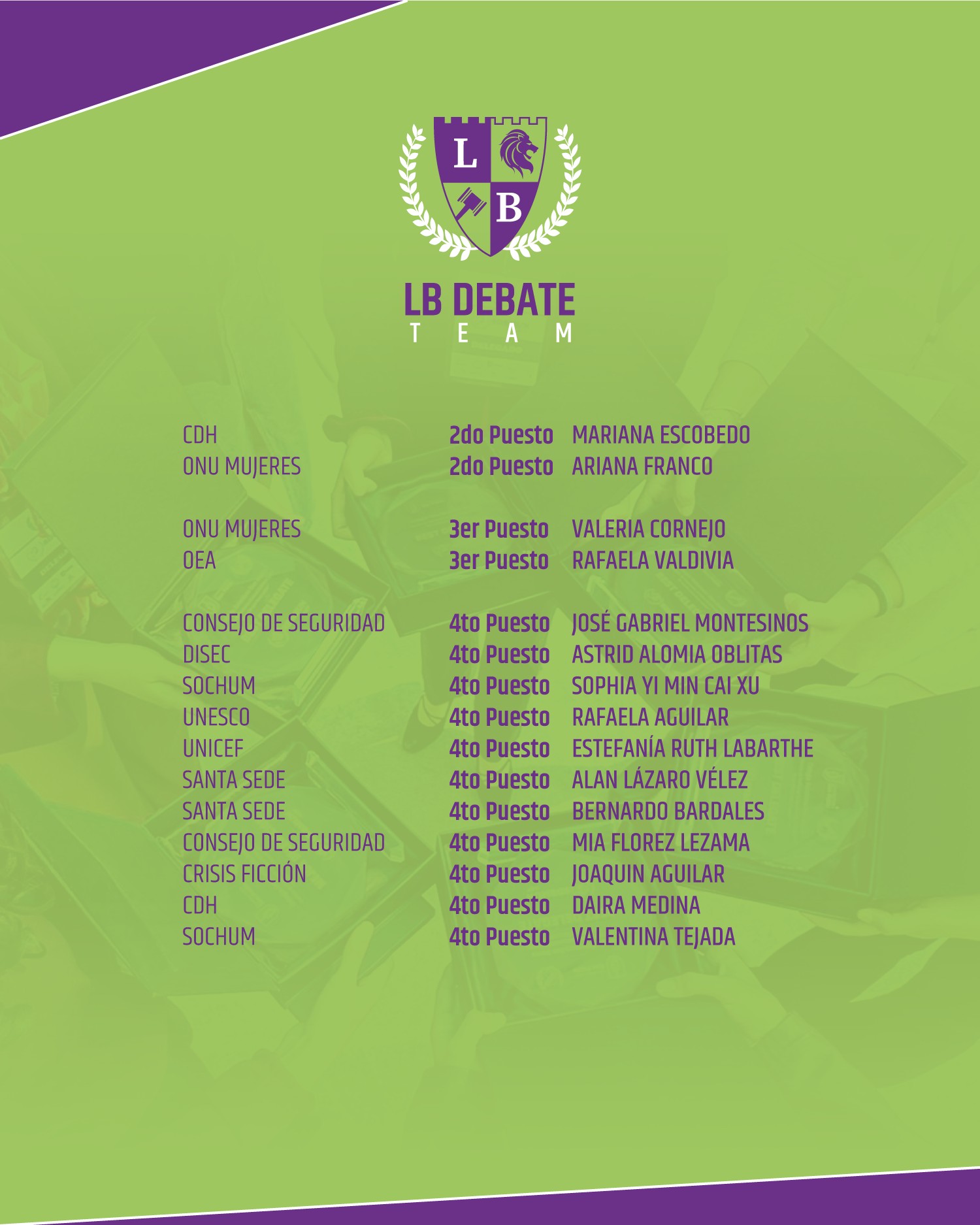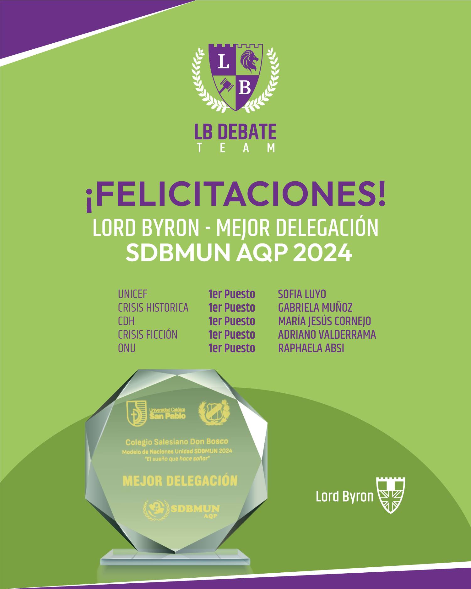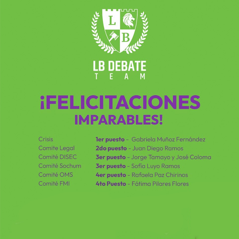 El Equipo de Debate del Colegio Lord Byron – LB Debate Team – busca generar un espacio de diálogo y oportunidad para desarrollar habilidades de argumentación, de escucha, de tolerancia y respeto a perspectivas contrarias, compartiendo y discutiendo percepciones, ideas y opiniones sobre lo que sucede en su entorno inmediato y en el mundo globalizado, adoptando la metodología del Modelo de las Naciones Unidas - MUN.